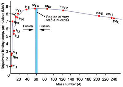 Figure III.2. Binding energy per nucleon EB/A (MeV/A) of elements as a function of their mass number (binding energy).