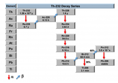 The third decay chain starts from 232Th, with the half-life of 1.4·1010 y. This A = 4n chain is called thorium series and it has ten radionuclides between 232Th and the terminal product 208Pb.