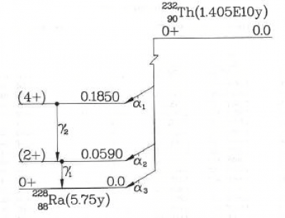 In gamma decay, the daughter nuclide releases its excitation energy by emitting electromagnetic gamma radiation (γ). When, for example, 232Th decays (Figure V.19) by alpha mode to 228Ra only a fraction (76.8%) of alpha particles receive the maximum energy of 4.011 MeV, the rest being decayed by emission of 3.952 MeV alpha particles (23.0%) and 3.828 MeV alpha particles (0.2%). These latter alpha energies are a cause of decay to excited states of 228Ra. The energies of gamma rays emitted in the de-excitation can be calculated from the energy differences of the alpha particles, for example, 4.011 MeV - 3.952 MeV = 0.059 MeV. There are also gamma transitions from one excitation state to another, for example, 0.126 MeV gamma rays are emitted from this kind of transition in case of 232Th decay.