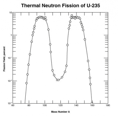 There is a large number of fission daughter products. They are, however, not evenly formed at various mass numbers. Instead, they are concentrated to two mass number ranges with mass numbers between 90-105 and 130-140. Graphical presentation of the fission product yields, the percentage of fissions leading to specified mass number, as a function of mass number results in the formation of a double hump curve given in Figure V.4. The upper mass range is independent of the fissioning nuclide while the lower mass range shifts into higher mass numbers as the mass of the fissioning nuclide increases.