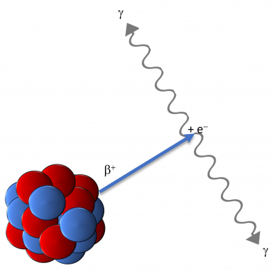The positron particle created in positron decay is unstable and, after losing its kinetic energy, it annihilates, i.e. it combines with its counter particle, electron. In the annihilation process, the masses of the two particles turn into kinetic energy of two gamma quanta. These gamma quanta emit to opposite directions and their energy is 0.511 MeV which corresponds to the mass of an electron. These gamma rays are used to measure activities of positron emitters since their measurement is easier than measurement through detection of positron particles.